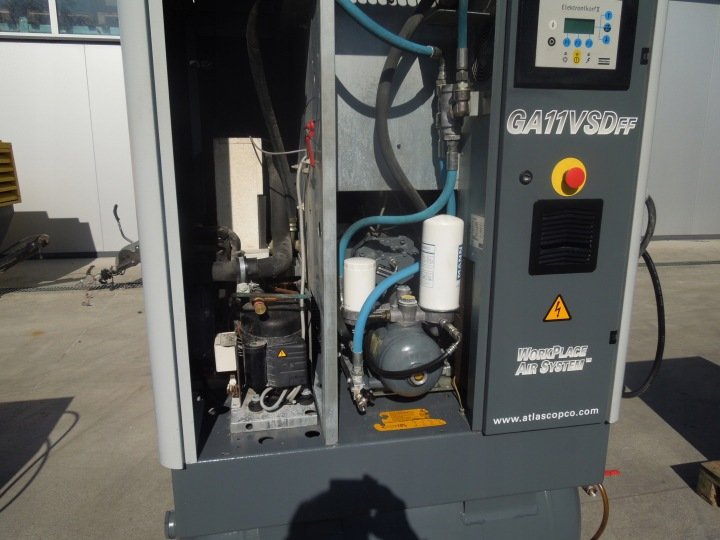 Sprężarka śrubowa ATLAS COPCO GA11VSDFF maszyna z falownikiem, osuszaczem na zbiorniku powietrza po serwisie